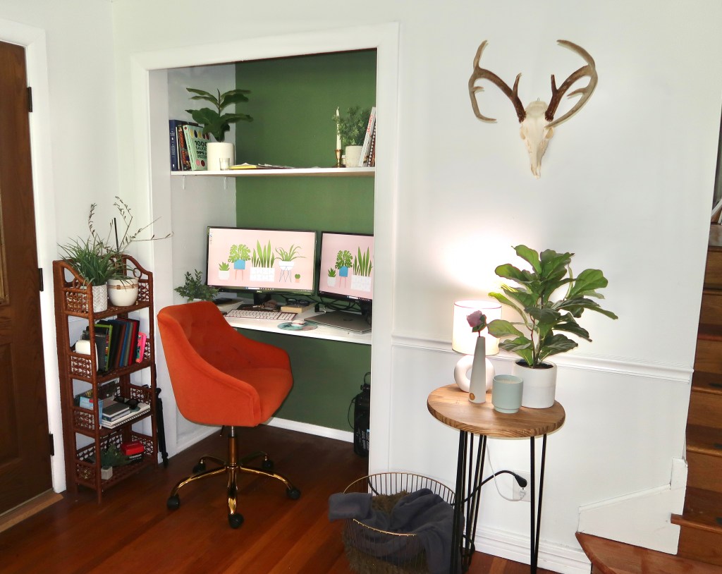 I *love* this set up. I can hear the tv behind me, have all the light from the windows filling my room, and feel connected to my house while I’m working.