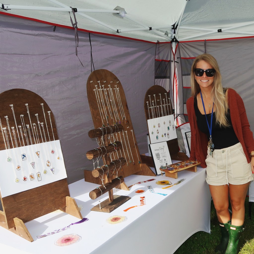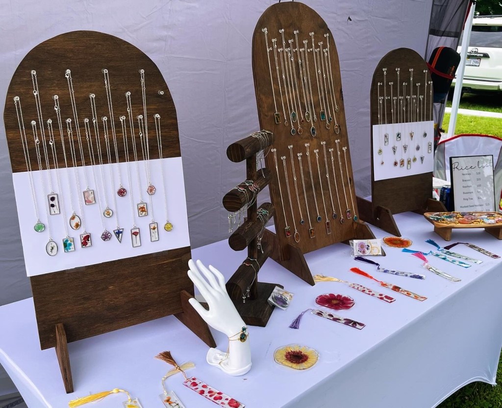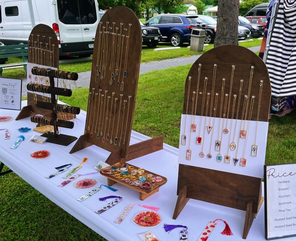 So about a year ago I started making jewelry with pressed flowers in resin – well, jewelry, bookmarks, keychains, & ring trays. This past weekend I was a vendor at Trail Days in Damascus, VA – a 3-day festival celebrating the Appalachian Trail.