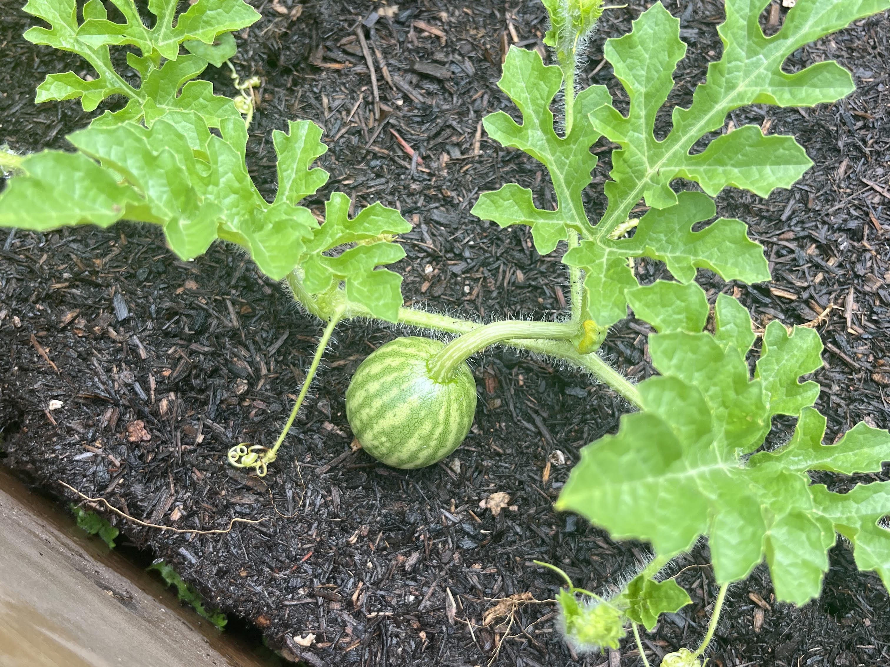 The watermelon (as pictured above) is growing too, and the vines associated with it are kind of crazy! They’re taking up almost a full 7.5×2′ bay!